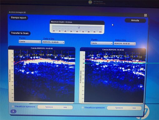 Lo strumento che uso è un ecografo che misura il grasso e il muscolo in determinate zone del corpo, con precisione millimetrica, usando ultrasuoni a 2,5 MHz.